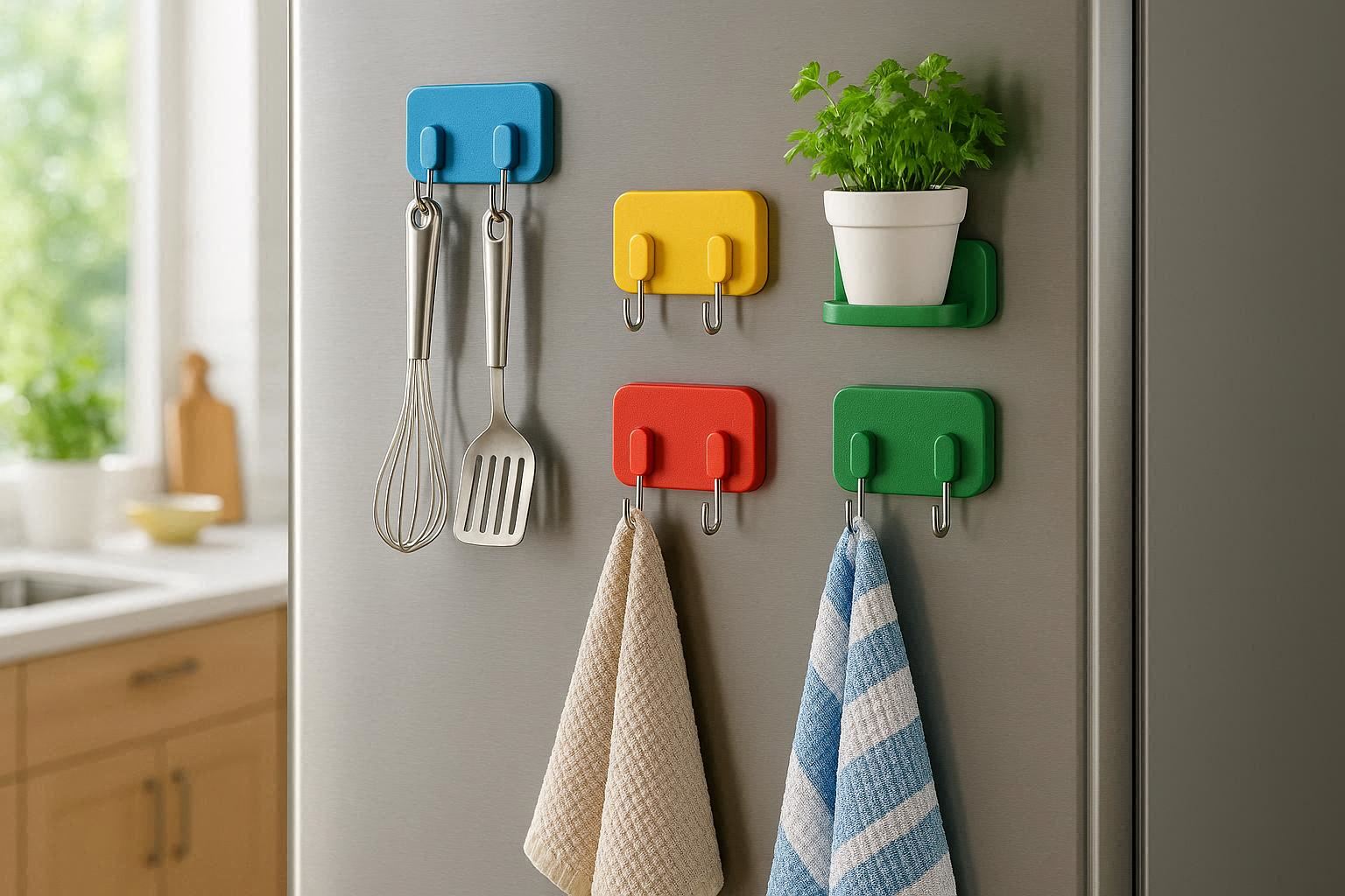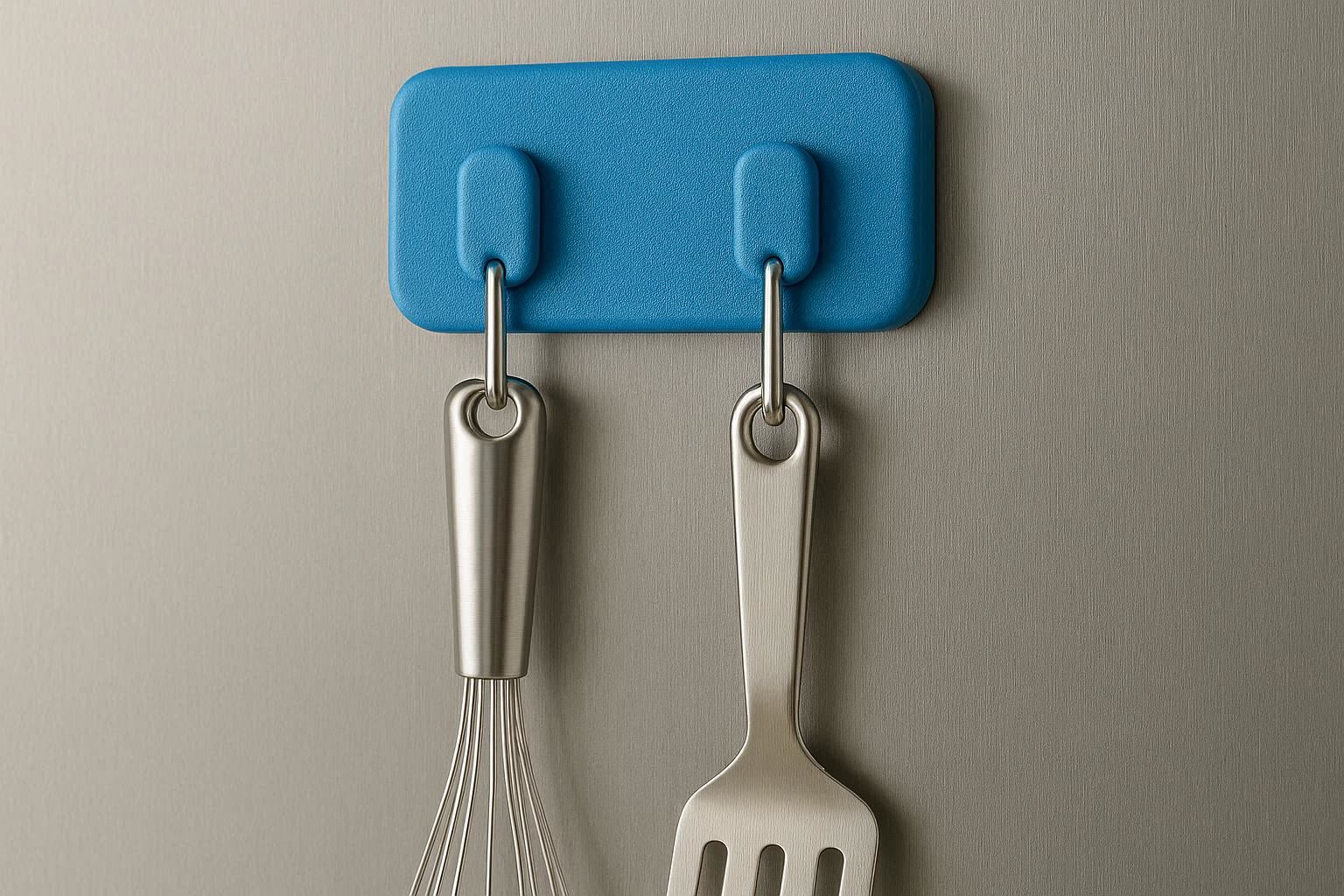 Powerful neodymium magnets hold utensils, oven mitts, or keys on metal surfaces. Rotating heads adjust hanging angles.